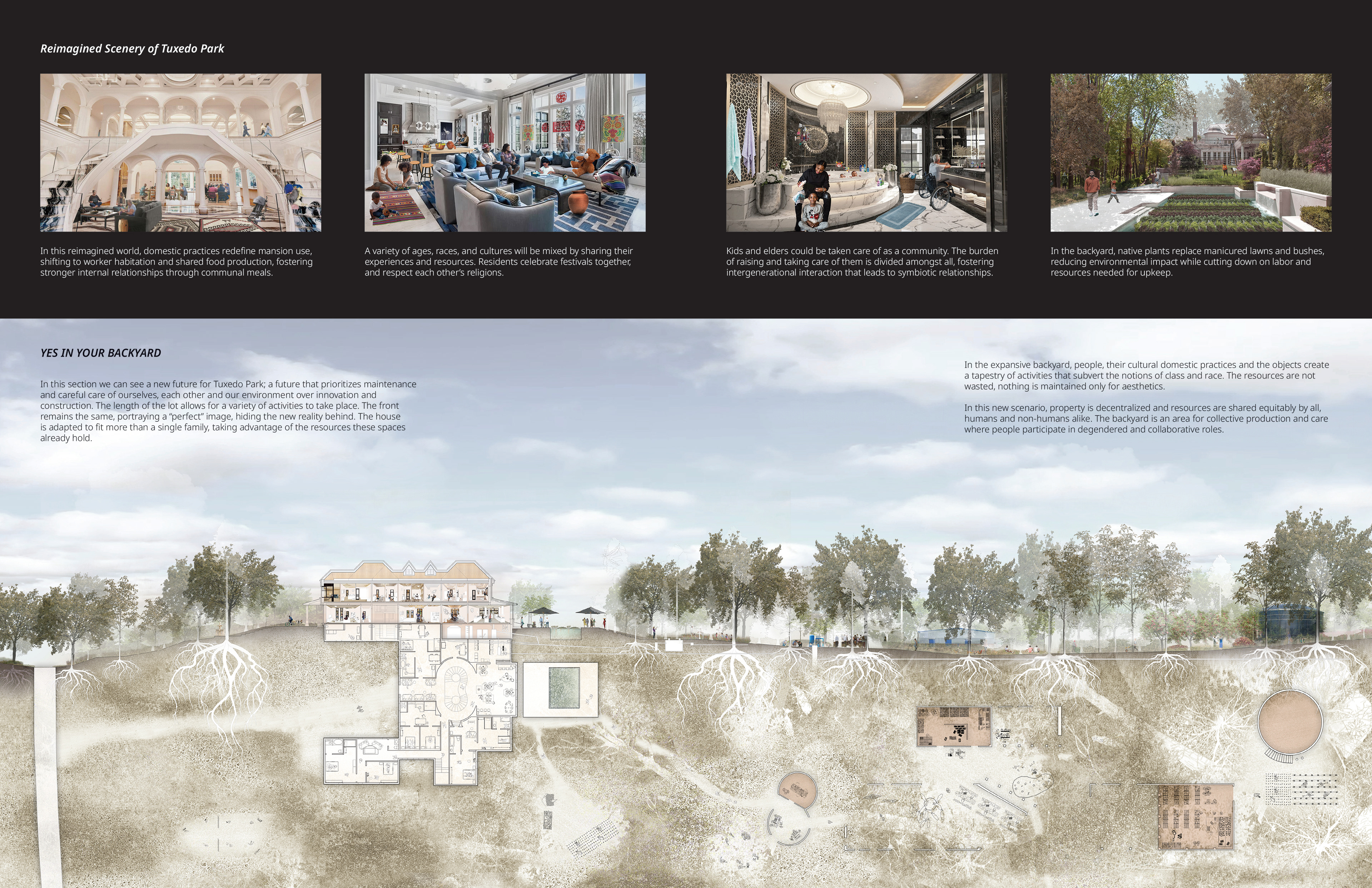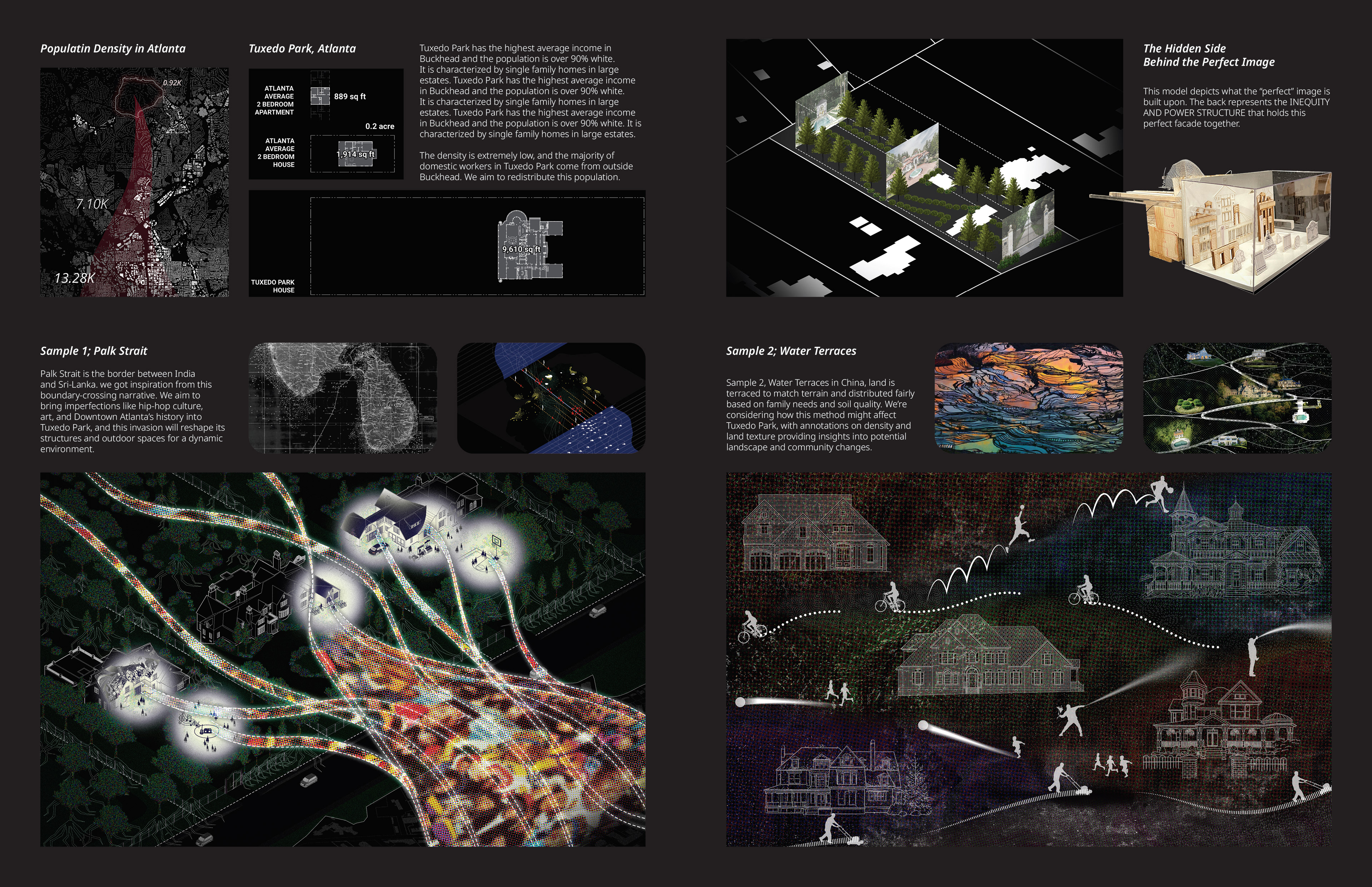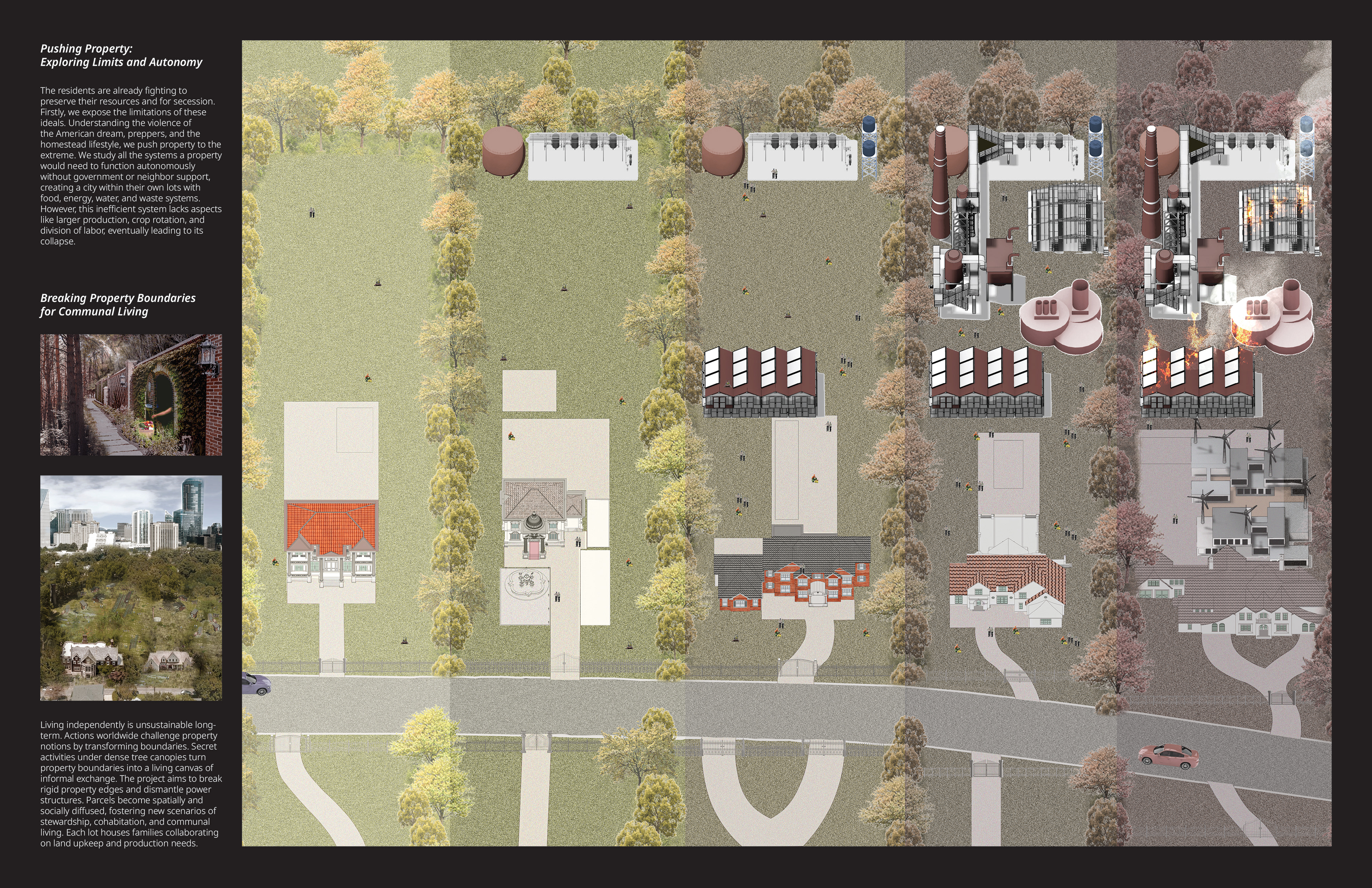 This project delves into the concept of property in Tuxedo Park, an affluent village nestled within Buckhead, Atlanta. It examines the power dynamics and socioeconomic disparities inherent in property ownership, envisioning a future “Atlanta After Property” world. In this hypothetical scenario, the project explores the potential challenges and opportunities of communal living, where boundaries are broken down, and properties are shared among local workers. By reimagining property ownership and fostering community collaboration, the project seeks to address inequalities and promote a more inclusive and equitable environment in Tuxedo Park.